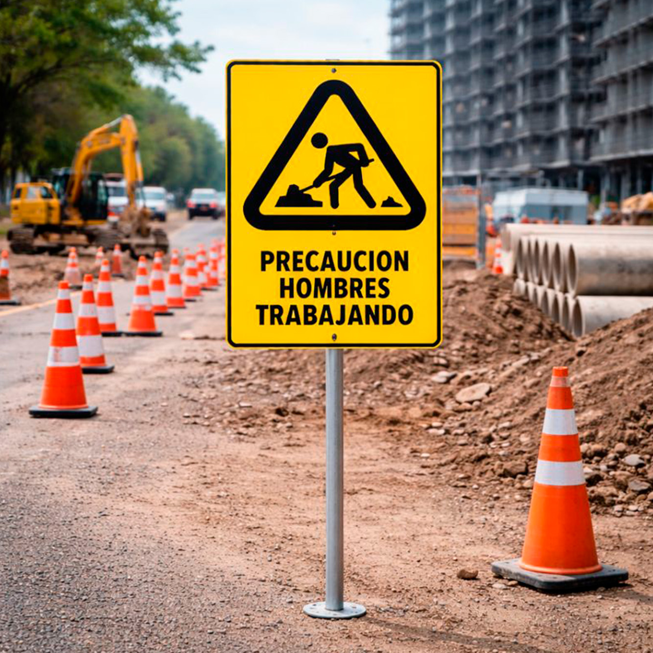 Se utiliza como parte de la señalización fija temporal o permanente en áreas de construcción, mantenimiento o intervención técnica, donde se requiere advertir sobre la presencia de trabajos activos.
